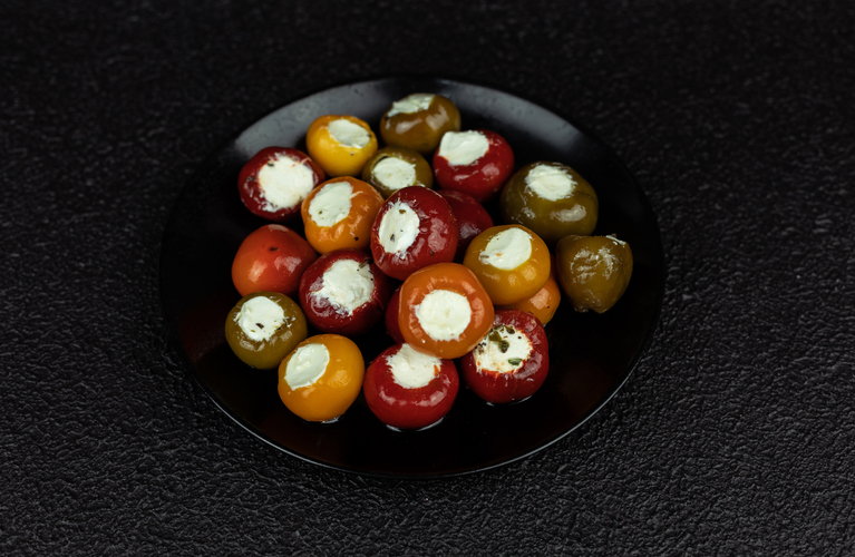 Описание: Перец маринованный черри пикантный фаршированный сыром в масляной заливке необычная и вкусная закуска. Выраженный вкус сыра гармонично сочетается с остро-сладкой мякотью перцев. Миниатюрные перчики черри в сочетании с нежным сыром являются классическим представителем греческой кухни.Помимо выдающихся вкусовых качеств перчики черри обладают богатым витаминно-минеральным составом, их регулярное употребление несёт колоссальную пользу для всего организма.
