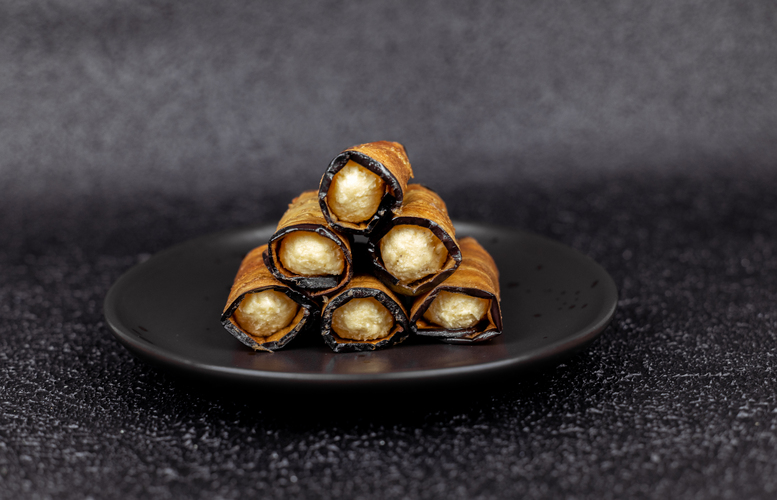 Баклажаны широко известны своими обширными лечебными свойствами за счёт содержания в плодах большого количества клетчатки, хлорогеновой и фолиевой кислот, витаминов группы В, железа, кальция, каротина, фосфора и калия. А сыр помогает в процессе обновления клеток, защите клеточных мембран, является источником кальция и белка.